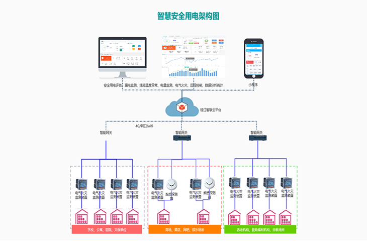 系统主要由数据采集层、传输层、云存储、主站构成。数据采集层通过具有通讯功能的智能仪表和传感觉。数据传输层由智能网关设备,负责接收现场采集器的遥测值和遥信状态等信息并进行分类组合,在通过4G、无线、以太网等方式向主站传输。用户通过电脑或手机APP访问查看,获得当前用电系统运行数据和设备运行状态信息。还可以主动向运行人员手机推送报警信息。